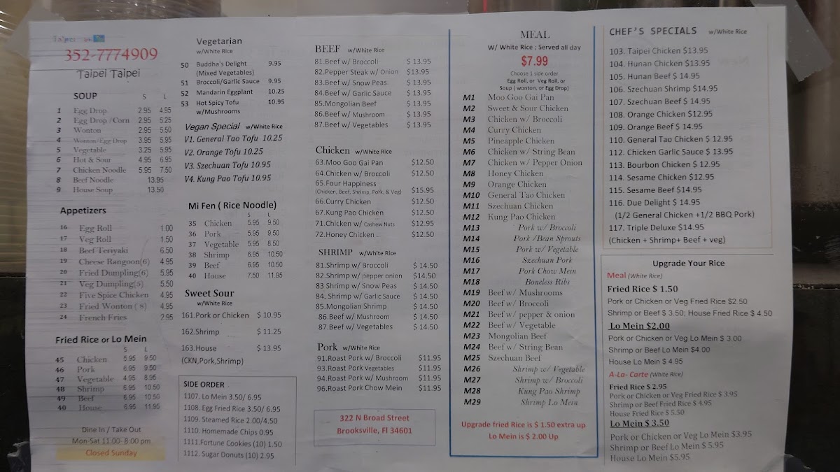 Welcome to Taipei Taipei, a culinary gem nestled in Brooksville, FL, where the vibrant flavors of Taiwanese-style Chinese food and delightful boba tea await you. This bustling eatery offers an enticing menu that features savory pork dishes, such as the Pork With Broccoli or the ever-popular Boneless Pork, each paired perfectly with white rice, fried rice, or lo mein—all for just $13.95.